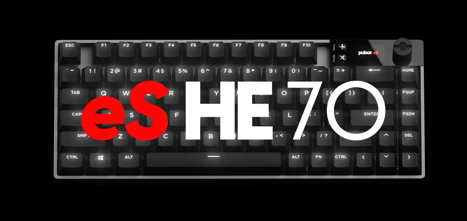 The compact 70% layout PULSAR ES HE 70 keyboard features a built-in LCD display and an adjustable knob, allowing users to customize functions directly on the keyboard without installing any software. Through the intuitive screen, you can easily configure actuation point, DKS, rapid trigger, macros, and more. It features magnetic switches and vivid RGB effects for enhanced responsiveness and immersion. With a dedicated profile button on top, you can quickly switch between four onboard profiles. Directional arrow keys are also included to eliminate the usual limitations of mini keyboards. These features make it an exceptional choice for gaming.
