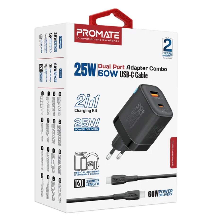 Promate 25W Dual Port Adapter Combo With 60W USB-C Cable