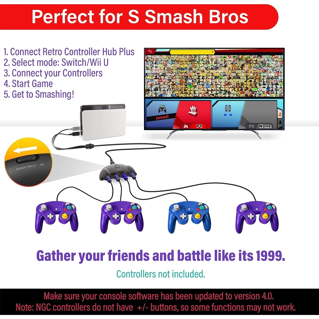 - Quick & Easy Set Up - The Retro Hub Plus allows up to 4 Retro Gamecube controllers to be plugged in, making it perfect for multiplayer gaming. Just plug the adapter into your Switch and connect the USB to your controller for a seamless gaming experience. No complicated setup process required.