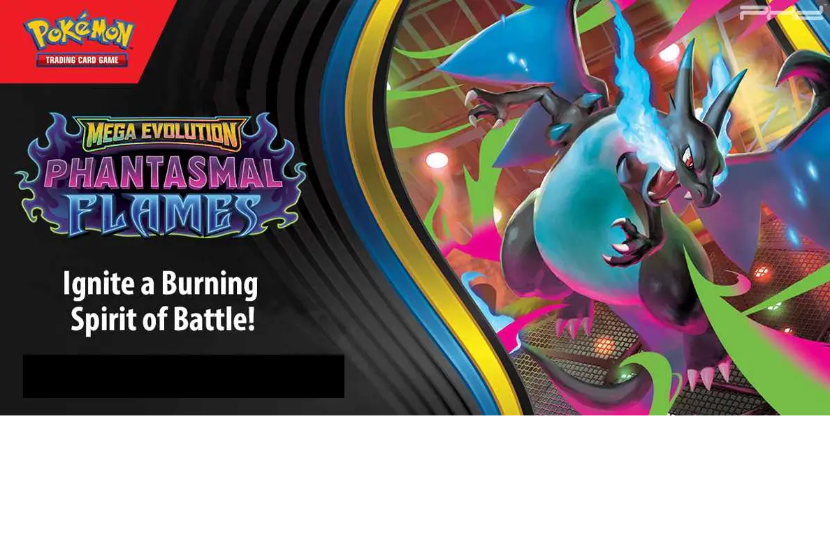 Mega Charizard X ex unleashes blazing blue flames while Mega Gengar ex rises from the shadows, ready for battle. Mega Heracross ex, Mega Lopunny ex, and more powerful Pokémon join the action in the Pokémon TCG: Mega Evolution – Phantasmal Flames expansion.